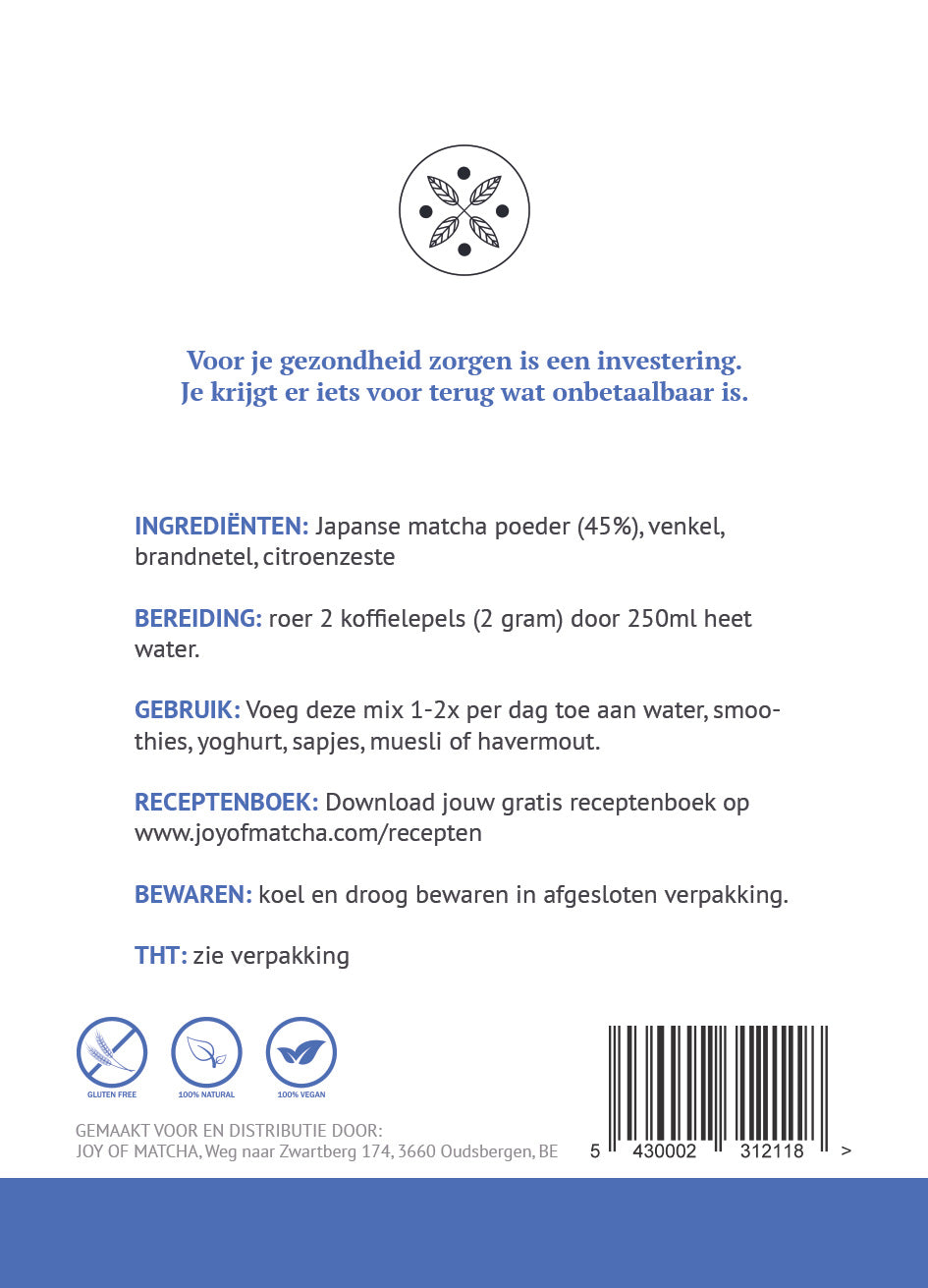 Gun jezelf de luxe van een heerlijk kopje Detox Matcha Thee van JOY of MATCHA en ontdek de kracht van deze verkwikkende, gezonde en duurzaam geproduceerde thee. Met de synergie van matcha, venkel, brandnetel en citroenschil, biedt onze lichaamsreinigende thee je een ongeëvenaarde wellness beleving en ondersteunt het je op weg naar een gezonder, vitaler en gelukkiger leven. Laat je verwennen door de rijke smaken en geniet van een moment van pure ontspanning en verjonging. Bestel nu jouw Detox Matcha Thee en ervaar het verschil!