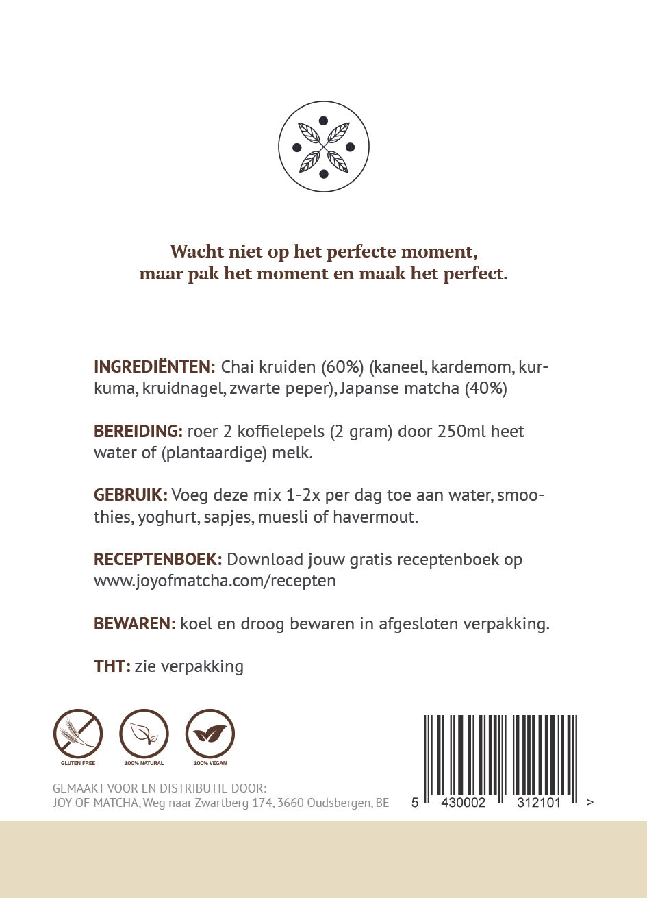 Wat is er beter dan een overheerlijke Spicy Chai Matcha met betoverende herfstsmaken. Deze hartverwarmende superfood thee bezorgd je een onvergetelijk herfstgevoel. Je vind er geen toegevoegde suikers, siroop, slagroom of kunstmatige smaakstoffen in. Dit is simpelweg de gezondste Spicy Chai Matcha die je kan vinden.